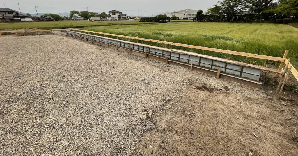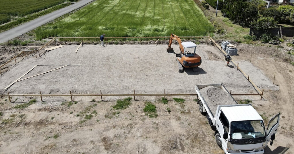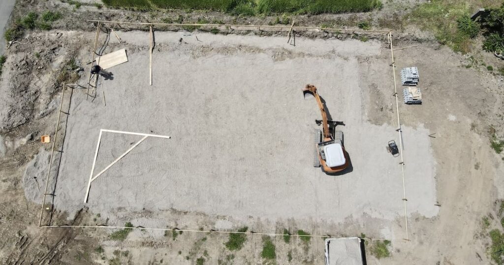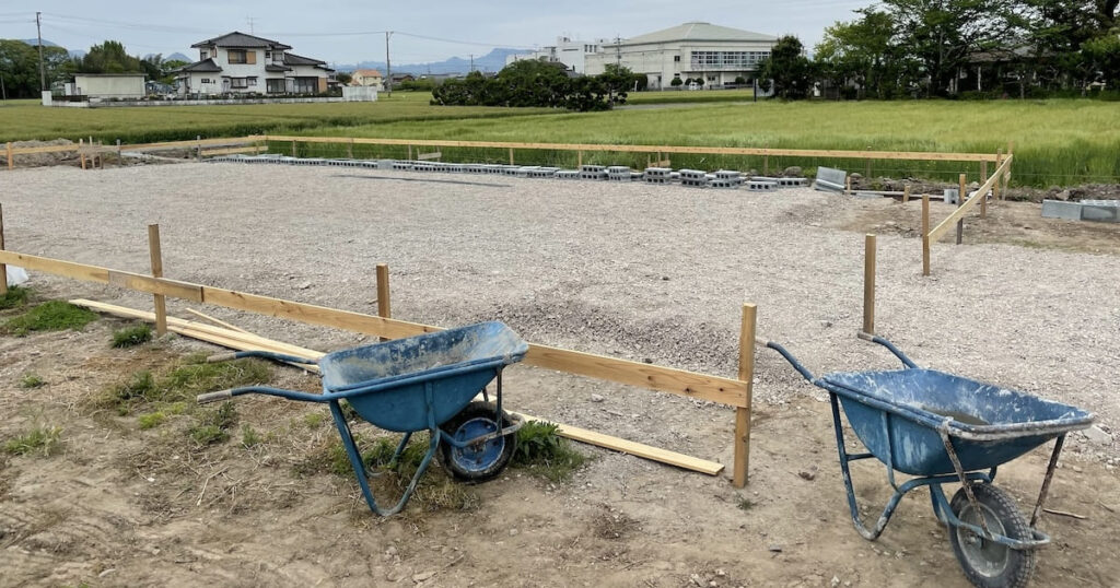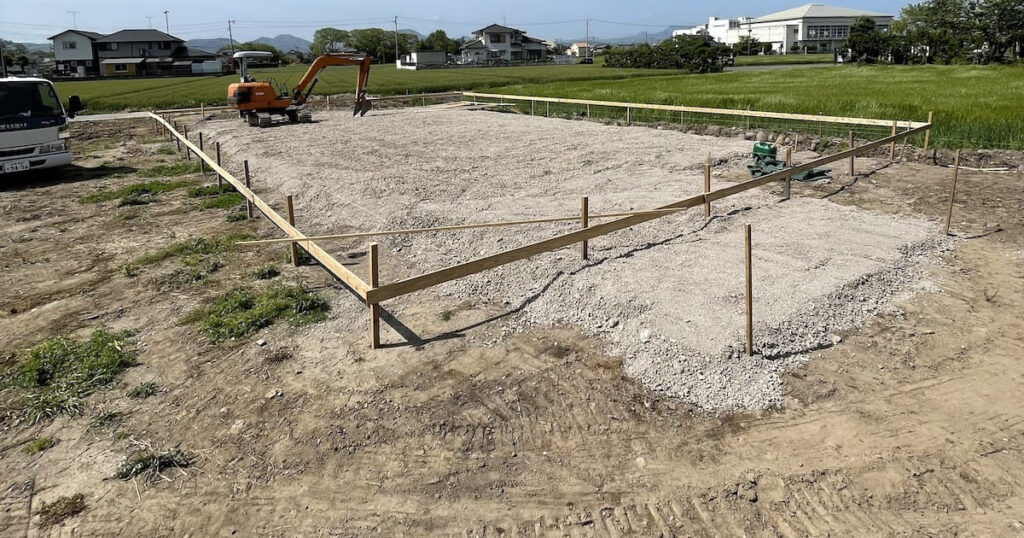 基礎工事を行う前に、敷地内の建物の位置・柱や壁の中心線・高さ・水平といった基準を正確に設定する仮設工作物を作成。