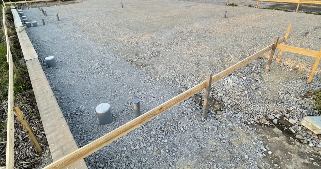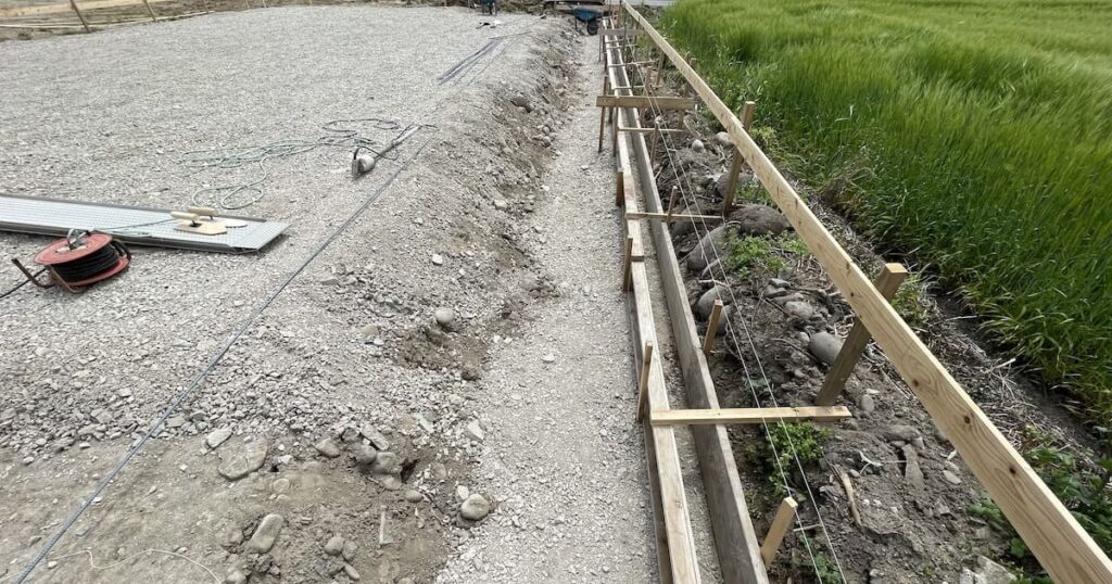外堀りに型枠をつくり、ベースになる生コンの打設工事を行う。