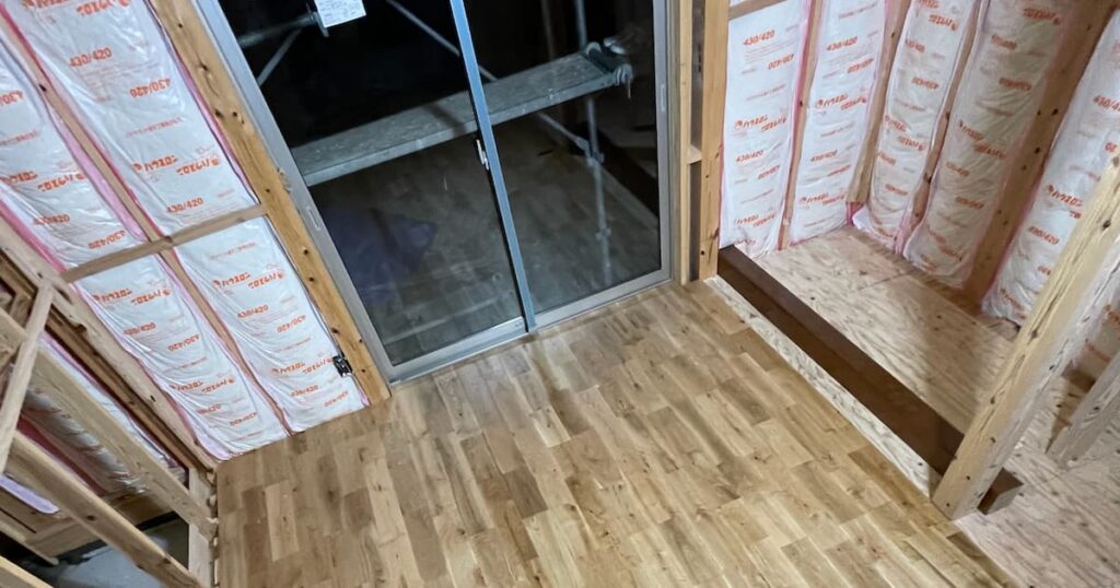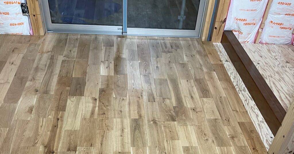 この部屋のフロア材は完全無垢材を使用した。ナラ材使用。