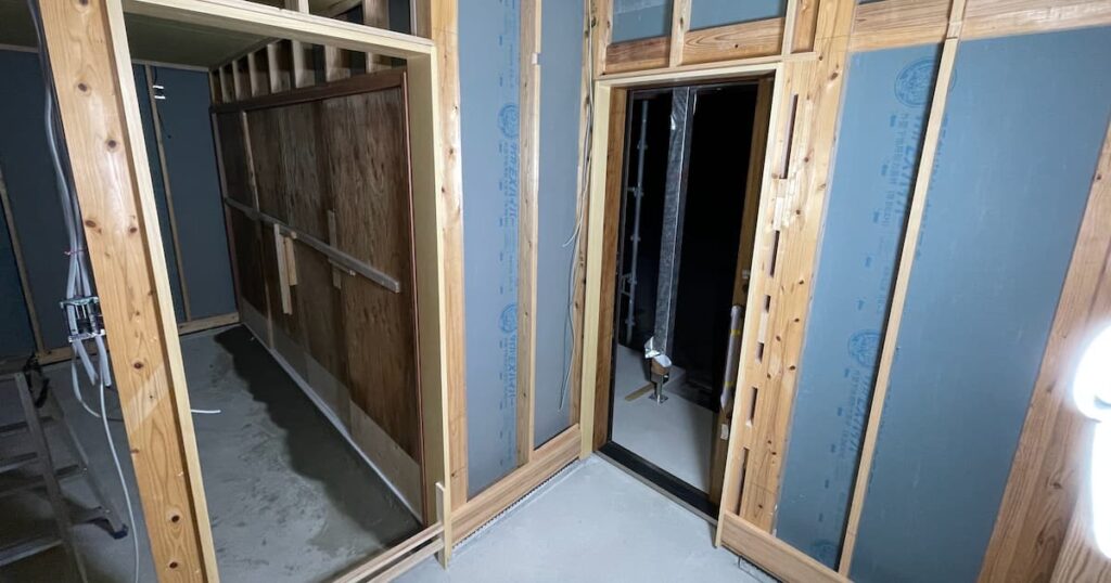 サッシ枠とドア枠に使う木材は「ヒバ」を使用。ウレタン塗装を施す。