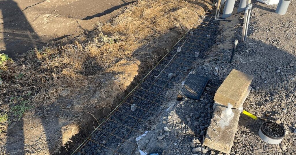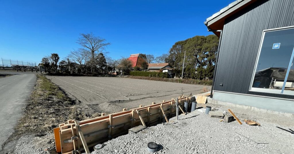 当初の予定では、自宅周りを全部生コンで敷き詰めたかった。