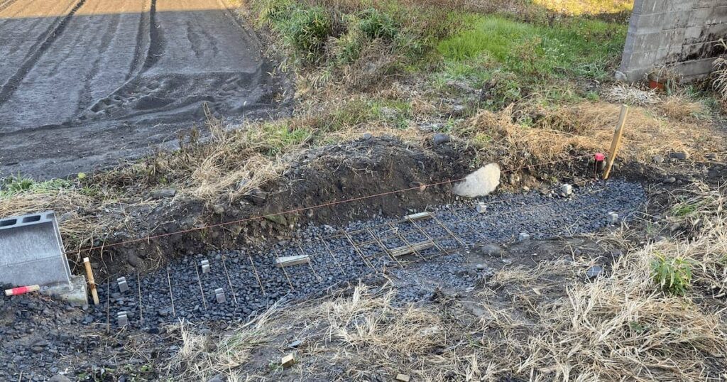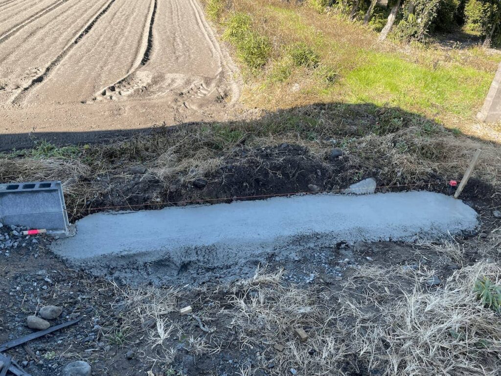 余った生コンは裏手の外堀のベースコンクリートとして流した。